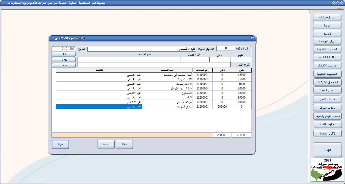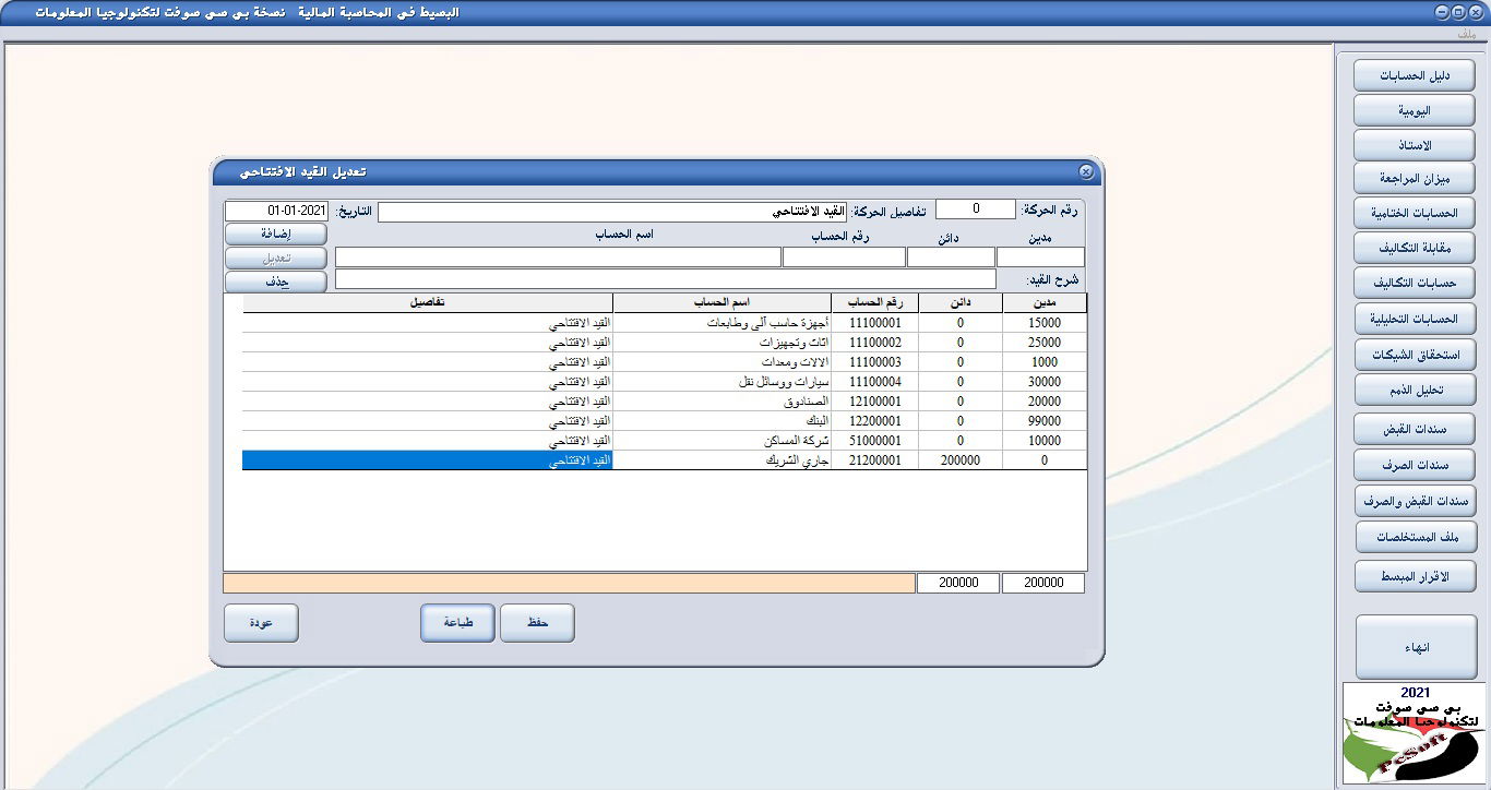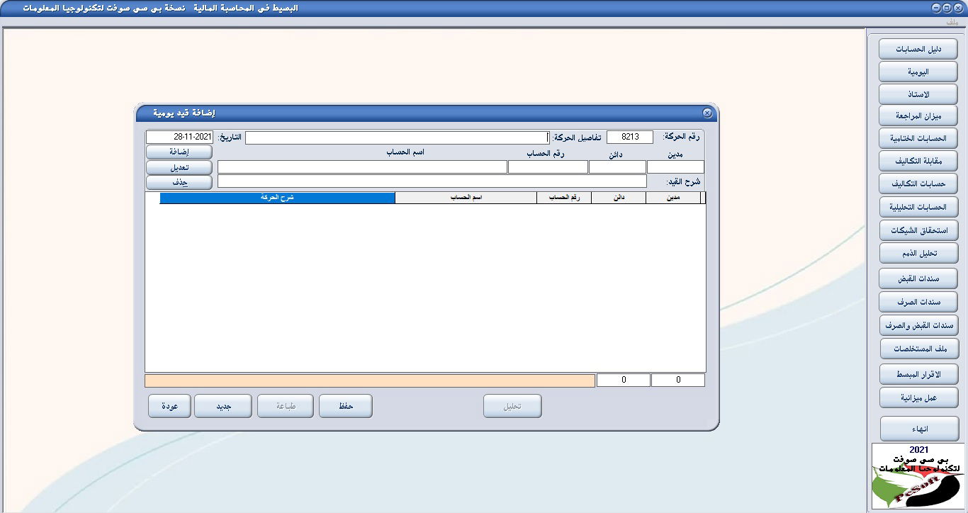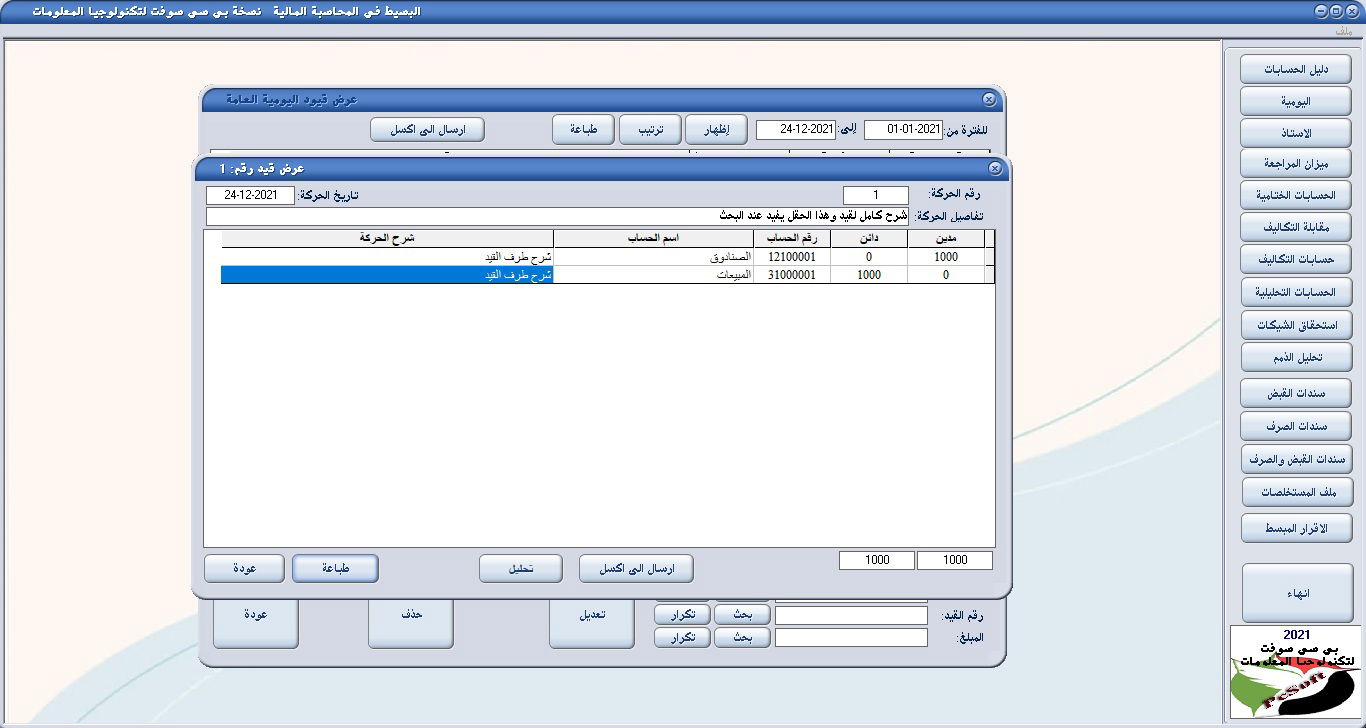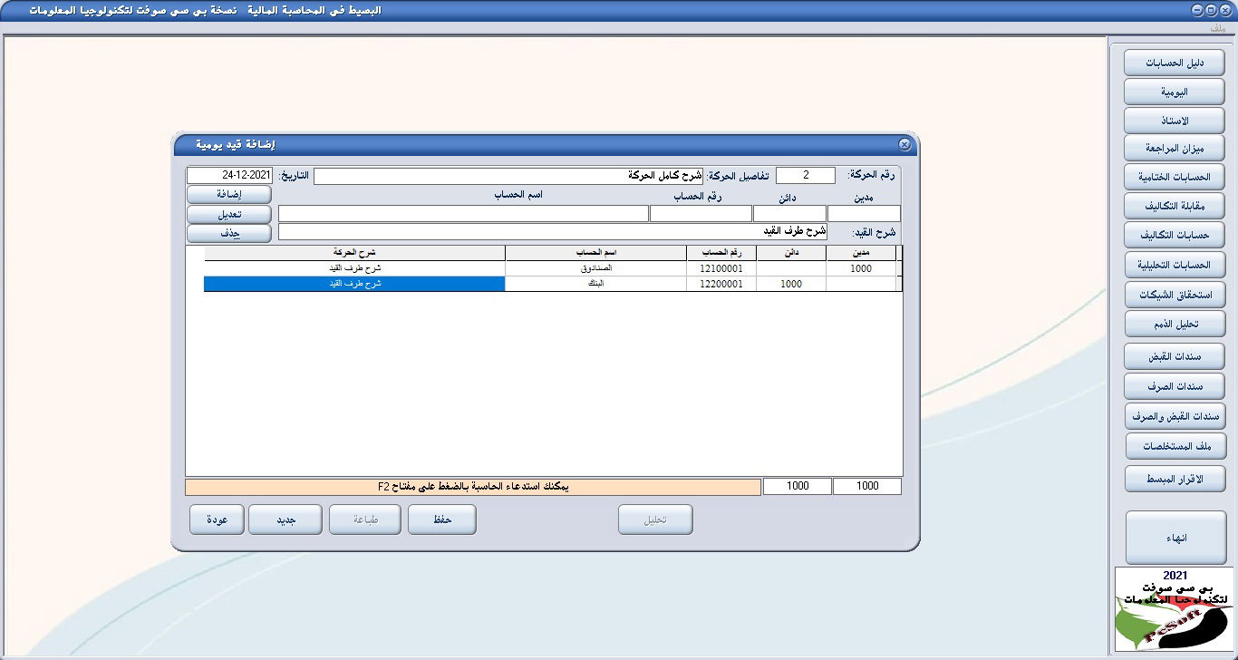 وهكذا الى نهاية القيد ويجب ان يتساوى مجموعي الدائن والمدين ثم الحفظ والطباعة
